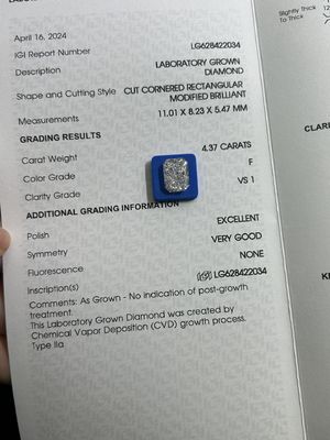 4.37ct Lab Grown Diamond Radiant Cut CVD F VS1 EX VG N IGI.